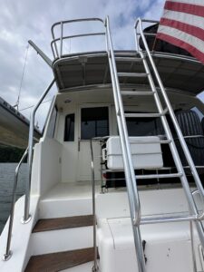 This extension was added by the previous owner. Not only does it extend the flybridge area giving more space to maneuver around the tender, but it also allows access without having to go through the salon.